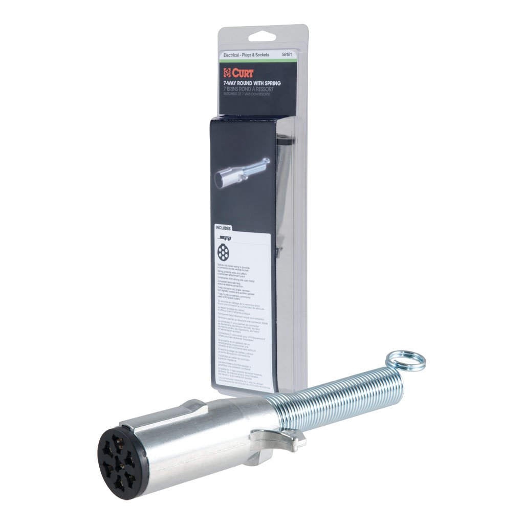 This 7-way round connector is designed to supply power for tail lights, turn signals, electric trailer brakes, auxiliary power, reverse lights, brake lights, and ground. It features durable die-cast metal construction and is a male-end plug, specifically designed for the trailer side of the connection. It also features a spring attachment to keep wires well protected. 7-way round connectors are commonly used on RV travel trailers, and this particular connector can be easily interchanged with other 7-way RV connectors.