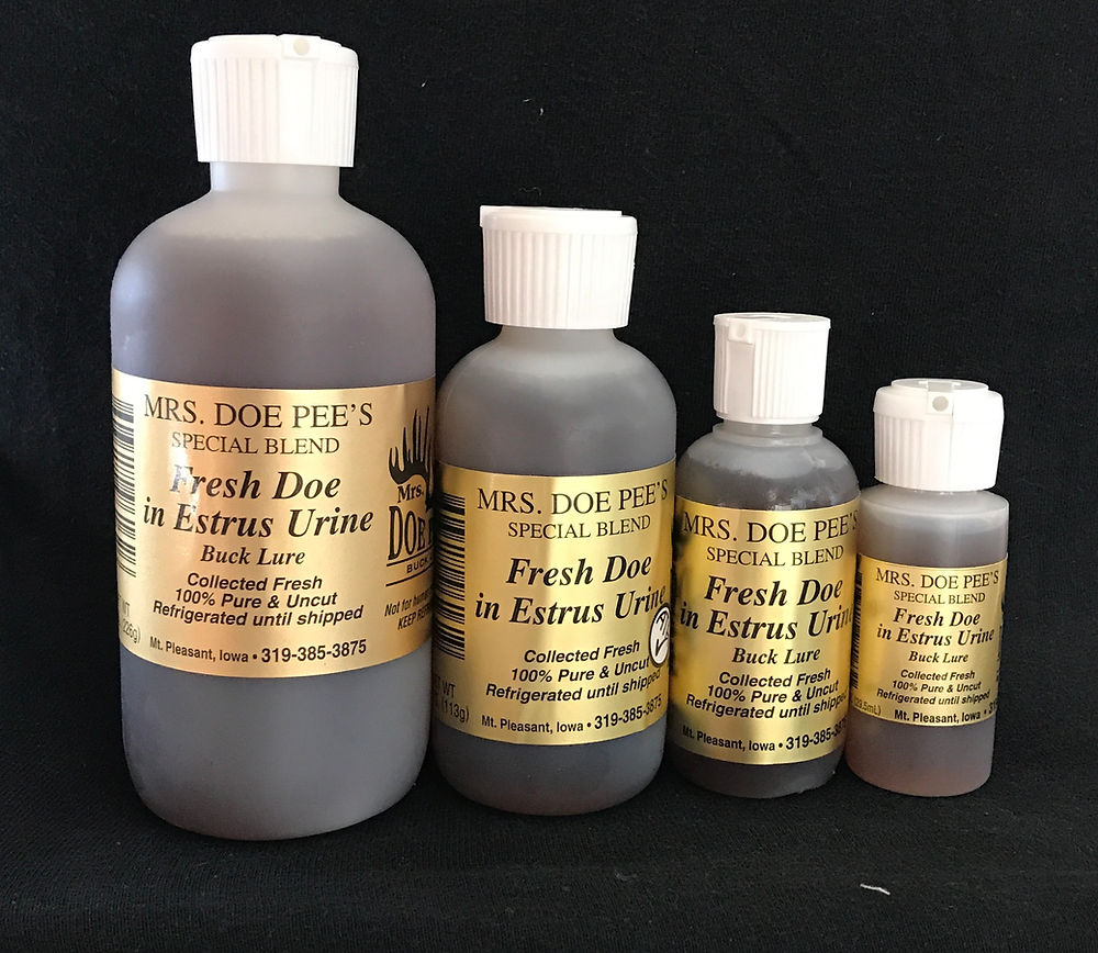 Mrs. Doe Pee's Doe in Estrus Passion is a true key to success. The "estrus" means that the there is a pheremone inside the urine, telling the bucks that this doe is ready to breed. If used during the pre-rut, you could send the bucks searching for the lone doe in heat, increasing your chances of taking the shot. If used during the rut, you could pull the buck in on the trail of a hot doe. If used duriong the post-rut, bucks might stay active looking for the one last doe to breed. Flip-Top lids allow easy use in the field, allowing you to apply to drag rags, or add to a huntable scrape. Mrs. Doe Pee's Doe in Estrus can be used anytime during the season, letting the bucks know there is a hot doe in the area.