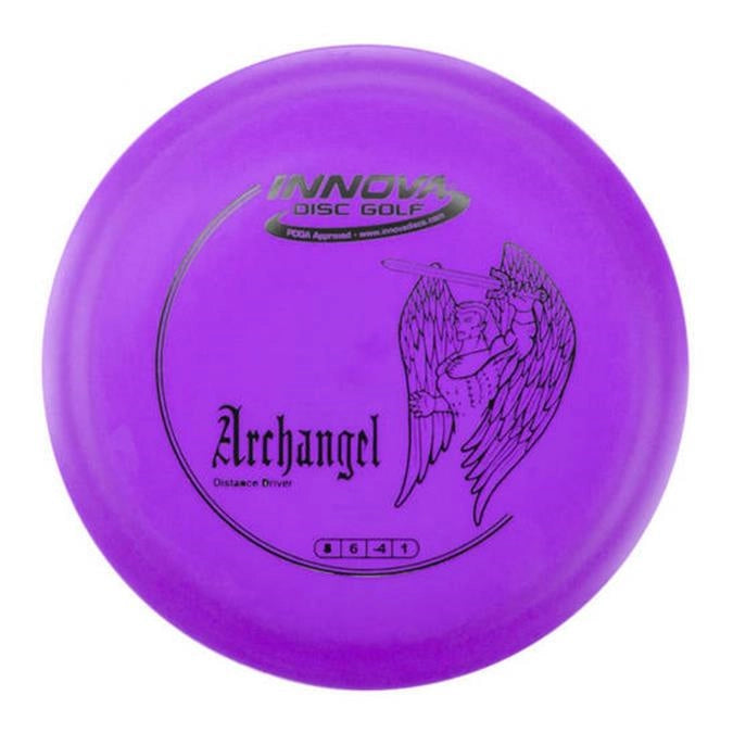 The Innova Archangel is one of the best discs for newer disc golfers who have trouble controlling fade on their drives. This disc has a good amount of high speed turn, excellent glide, and limited fade to help young players achieve maximum distance. The Archangel is available in the inexpensive DX plastic and is available in weights from 150 to 175 grams. The high understable flight characteristics help make this disc a good one for roller shots. 8/6/-4/1. DX is an inexpensive, basic plastic. It has good grip, but wears more easily than premium plastics.