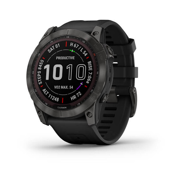 Meet any athletic or outdoor challenge with the rugged fenix 7X Sapphire Solar multisport GPS watch. Its scratch-resistant Power Sapphire solar charging lens uses the sun's energy to extend battery life – powering advanced training features, sports apps, health and wellness monitoring sensors and more. Get a battery boost from the sunlight, so you can go longer between charges. How is your body holding up? Wrist-based heart rate1 and Pulse Ox2 will let you know. Navigate with preloaded TopoActive maps and use built-in Wi-Fi for easy updates. Keep great tunes coming with music on your wrist – and no phone to weigh you down. When it gets dark, the built-in LED flashlight helps keep you going. Do more. Charge less. Solar charging yields up to 37 days of battery life in smartwatch mode3.