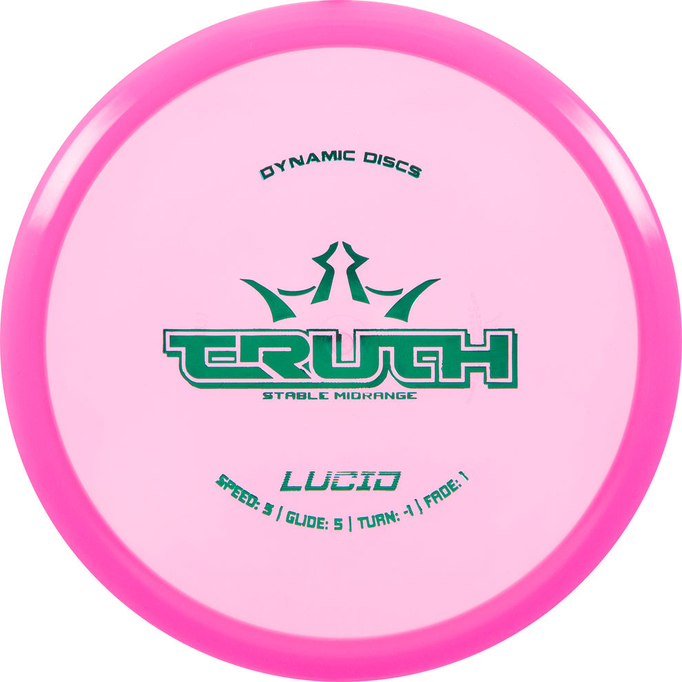 Dynamic Discs Lucid Truth – The best midrange disc in the game. The Roc and the Buzzz showed us how versatile and trusted a midrange can be. We took the best of all worlds and the Truth has been revealed. Hyzer, straight, anhyzer, distance, approach, low ceiling power shots, high floating drop shots, all have been accomplished with the Truth. Beginners and World Champions love this disc and lower their scores with it and you will, too. Speed: 5 Glide: 5 Turn: -1 Fade: 1 Max Weight: 180g About Lucid: The perfect combination of polymers produce some of the most beautiful and durable plastic in disc golf. This translucent blend can take a beating and maintain the original flight characteristics of the disc for many rounds of disc golf. The Lucid version of a disc will be slightly more overstable than the Fuzion version. Stamp color will vary. Shade of disc may vary. For example, blue could be a light shade or a dark shade.