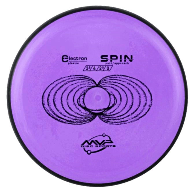 The Spin is a new putter from MVP Disc Sports, who describes the disc as "an understable putter that will debut in the 2016 Circuit Event Series. It has a deep profile the like the Ion and Anode, which makes it great for glide-filled lofty flights. Its controlled understability makes it suitable for both new and advanced players alike. 3/4/-2/0. Electron is MVP's mid-grade, softer plastic. It feels amazing, but it is not made for taking a beating at high velocity. It is primarily formulated for putters.