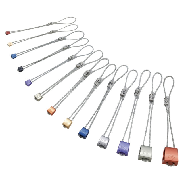 A full set of all sizes of Stoppers on a Micron carabiner to protect everything from tip seams to finger cracks. Black Diamond Stoppers are an essential for every trad rack, designed with a transverse taper that permits sideways placements in flares and shallow seams. Anodized by size, they're quickly identifiable and rounded edges make for easy removal. Each Stopper is equipped with a durable, galvanized steel cable.